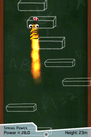 Sie können in diesem Spiel mit einer Feder springen. Die Feder spannt man, indem man auf der Feder mit dem Finger eine Bewegung nach unten macht und dann die Sprungrichtung auswählt. So kann man dann von Plattform zu Plattform springen. Allerdings sollte man sich dabei nicht zuviel Zeit lassen, denn je länger man braucht um abzuspringen, desto geringer wird die Sprungkraft. Ein nettes Spielchen für Zwischendurch, das doch anspruchsvoller ist, als man zunächst denkt.