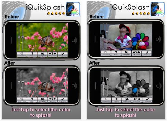 Die gerade kostenlos erhältliche Bildbearbeitungs- App iQuikSplash reduziert Farbbilder auf eine Bicolor-Optik. Die Ergebnisse können sich sehen lassen, deshalb kommt von uns eine klare Empfehlung dafür. Das kleine Tool mscht einfach Spass: Foto aus dem Fotoalbum aufrufen und anklicken, auf welche Farbe im Bild das Bild reduziert werden soll.
