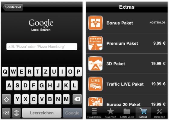 Inzwischen hat die Navigations-App die Feuertaufe bestanden und sich ebenbürtig zur fest eingebauten Navigation im Auto gezeigt. Wir haben die App mit dem kostenlosen Bonus-Paket und dem Premium Paket aufgewertet. Das Premium Paket für 9,99 Euro bietet mit MyRoutes gleich mehrere Routenvorschläge und eine gestochen scharfe 3D-Grafik als Hauptvorteile.