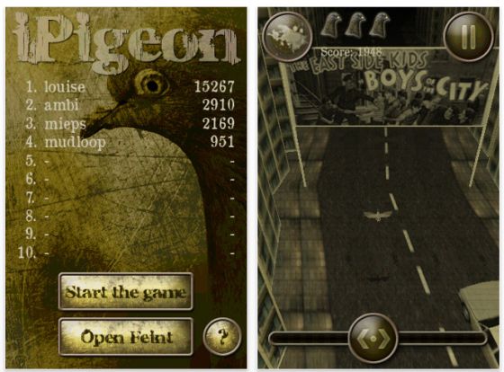 Manche Apps werden dadurch außergewöhnlich, dass sie einfach mal anders aussehen, als all die anderen Apps. iPigeon ist so eine App. Etwas düster gezeichnet, erinnert iPigeon an einen alten Film. Man ist eine Taube, die durch die Häuserschluchten einer Großstadt fliegt und dabei aufpassen muss, nicht mit Hochhäusern oder Werbetafeln zusammenzustoßen. Doch damit nicht genug: Das Spiel erwartet auch, dass man die auf der Straße fahrenden Autos bekleckert. So einfach ist das nicht, denn dazu muss man gut zielen. Doch wenn man trifft, gibts Extrapunkte.
