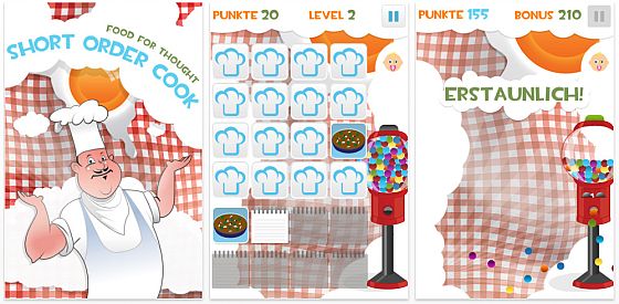 Memory-Spiele gibt es für das iPhone und den iPod Touch in sicher ausreichender Zahl, deshalb stellen wir diese Spiele nur noch vor, wenn sie etwas Besonderes zu bieten haben, so wie Short Order Cook. Sie schlüpfen hier in die Rolle des Kochs und drehen mal kurz die Küchen Bons um und ordnen dem Bild, was Sie da gesehen haben, das richtige Essen zu. Klingt erstmal ganz einfach – aber wer einmal in der Küche eines Restaurants war, weiß, wie hektisch es da zugeht – und so zeigt Ihnen das Spiel den Bon und die Position der Speise vom Bon nur sehr kurz und mit steigendem Level gibts halt auch mehr Bestellungen und damit noch mehr Hektik.