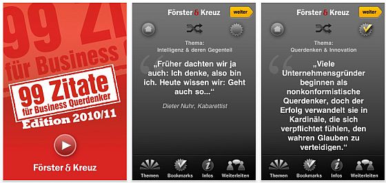 Erst seit gut zwei Wochen ist die App 99 Zitate für Business-Querdenker online im App-Store und schon ist sie wie eine Rakete in den Ranglisten aufgestiegen: Vergessen Sie die angestaubten Allerweltszitate. Schiller, Shakespeare & Co. sind nicht immer der Weisheit letzter Schluss. In der App gibt es 99 frische, freche Zitate – für Business-Querdenker und für eine neue Generation in Wirtschaft und Management. Die App wurde entwickelt von CatWorkDesign im Auftrag der Agentur Förster & Kreuz.