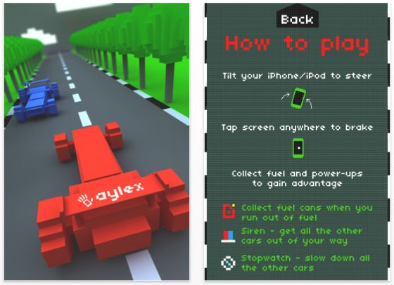 Sie „fahren“ mit Ihrem Rennwagen auf einer breiten Straße, auf der natürlich auch andere Fahrzeuge unterwegs sind. Obwohl es nur geradeaus geht, kommt es irgendwann unweigerlich zum Unfall. Und wenn das nicht so schnell passiert, dann wird es auch mal Nacht, oder Sie geraten auf eine Ölspur. Die Steuerung erfolgt über den Bewegungssensor Ihres Geräts. Es gibt ohnehin nur eine Möglichkeit, nämlich links oder rechts fahren. Man kann auch auf das Display tippen, dann bremst man. Aber wie sagen es die Profis? Wer bremst, verliert!