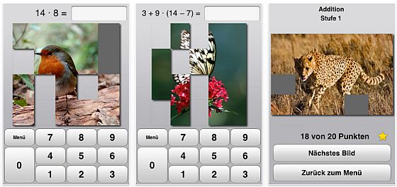 Zur Belohnung für richtiges Rechnen setzt sich mit jeder richtigen Lösung ein Puzzlebild etwas mehr zusammen.