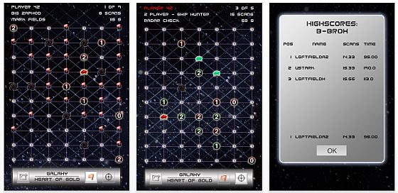 Das Spiel „Galaxis – Heart of Gold 1.0“ ist eine moderne Mischung aus Minesweeper und Schiffe Versenken. Die App versetzt den Spieler in die Rolle eines Raumschiff-Kapitäns, der den vor ihm liegenden Weltraumsektor durchleuchten muss. Irgendwo in dem dunklen Schwarz vor ihm sind einige wehrhafte UFOs verborgen. Nur wo? Das gilt es herauszufinden.
