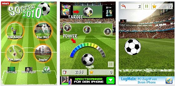 Run Away: Mit dem Finger steuert der Spieler einen Fußballer über den grünen Rasen, um gelbe Sterne einzusammeln. Dabei muss er den überall herumkullernden Fußbällen ausweichen. Verschiedene Powerups helfen dabei, Bälle aufzuessen oder sie einzufrieren. Außerdem kann der Fußballer mit einem Schutzschild versehen werden. Hier stört etwas, dass die Bälle doch recht klein sind und man unter dem Finger den Spieler manches Mal im Blindflug laufen lassen muss.