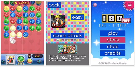 Die Spiele, in denen man 3 gleiche Teile auflösen muss, sind sehr beliebt, weil man sie so gut zwischendurch spielen kann. Es gibt unzählige Varianten, von denen wir einige bereits vorgestellt haben. Heute gibt es das Schnelldenker-Spiel 180 von Headcase Games gratis im Download (Normalpreis 1,79 Euro). Hier schießt Ihr Münzen auf noch leere Felder und versucht damit, Reihen von mindestens drei gleichen Münzen zu erzeugen, die sich dann auflösen.
