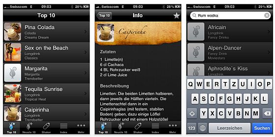 Aus der Schweiz kommt die kostenlose App Cocktails, mit der sich über 2.300 Cocktail-Rezepte aufrufen lassen. Jeder Cocktail ist genau beschrieben: Man erfährt, welche Zutaten man braucht und wie man ihn mixt. Gut ist, dass man auch anhand der Zutaten nach Cocktails suchen kann. Man hat also eine zum Beispiel noch eine angebrochene Flasche XY und kann dann nach dazu passenden Cocktail-Rezepten suchen. Es gibt auch eine Suche nach Stimmung bzw. Anlass und Geschmacksvorlieben.
