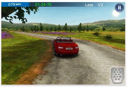 Man muss nämlich auf den Strecken die vorgegebenen Zeiten unterschreiten, um die nächste Strecke freizuschalten. Die Tour führt durch acht verschiedene Szenarien in vier Regionen: Country Cruise (Landstraße), Ocean Motion (Steilküste), Desert Ride (Wüste) und Mountain Thrill (Berge) immer mit der passenden Background Musik, made by Mazda & Street Hi-Fi.