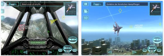 Beschleunigungssensor oder Steuerelemente: Wähle die Steuerung, die dir gefällt. Verfolge das Geschehen aus dem Cockpit oder wähle eine Außenbordansicht, um taktische Entscheidungen zu treffen oder um Raketen auszuweichen.