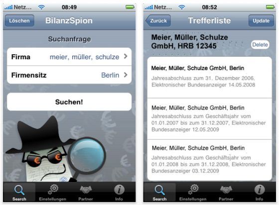 Der BilanzSpion von German Apps (Ralf Niewald) ist die erste iPhone App für eine Basis-BilanzRecherche über deutsche Unternehmen und kann Ihnen unterwegs schnell wichtige Fragen beantworten – überall und jederzeit. Die App nutzt dafür die von etwa einer Million deutscher Unternehmen veröffentlichten Jahresabschlüsse, die im Internet unter ebundesanzeiger.de abgerufen werden können.