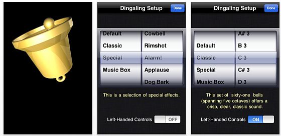 Die kostenlose App Zibblerbell von Clarkwood Software macht Dein iPhone oder Deinen iPod Touch zu einer Glocke. Wenn Du das Gerät hin und her bewegst, kannst Du die Glocke ertönen lassen. Wenn Du mit dem Internet verbunden bist, stellt die App Dir 61 verschiedene Glockentöne zur Verfügung, die nach Tonhöhe sortiert aufgelistet und von Dir ausgewählt werden können. Im Bereich Special kannst Du weitere Töne nutzen, wie zum Beispiel Alarm, Hundegebell, Kuhglocke, Schlagzeugtusch und Applaus.