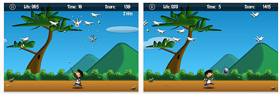 Jeder Taubendreck, der Dich trifft, kostet Dich 5 Lebenspunkte. Du kannst aber auch Lebenspunkte aufbauen, indem Du die gemusterten Eier fängst. Goldene Eier, die auch vom Himmel fallen können, erhöhen Deinen Punktestand um jeweils 800 Punkte. Wenn Du Tauben abschießt, bekommt Du je nach der Geschwindigkeit der Taube Punkte, triffst Du fünfmal hintereinander, wird der Multiplikator um 1 erhöht.