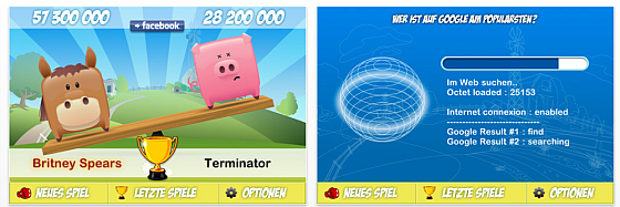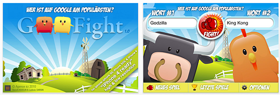Mit Goofight von Agence ici vergleichst Du für zwei Begriffe ihre Google-Popularität. Die App ist niedlich gestaltet und lädt dazu ein, verschiedene Begriffe einzugeben und nachzusehen, welcher der beiden Begriffe mehr Treffer auf Google erreicht. Die Spielmöglichkeiten sind dabei nur von Deiner Phantasie begrenzt, Du kannst verschiedene Marken eingeben, Schauspieler, Sänger, Dich selbst und Deine Freunde… Man kann das Spiel auch zu mehreren spielen und eine Facebook-Anbindung ist vorhanden, so dass man auch über Facebook spielen kann.