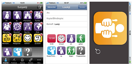 Die App sammelt die einzelnen Piktogramme in thematisch gebundenen Containern, so dass es kein Problem ist, schnell alle Bilder zum Thema „Familie“, „Geschäft“ oder „Religionen“ zu finden und zu sichten. Überhaupt sind alle Symbole so in der Auswahl angeordnet, dass häufig benötigte Piktogramme besonders schnell zu finden sind. Nicht nur das: lookji bringt als Piktogramme auch Fragezeichen, Ausrufezeichen oder Zahlen mit. Und es ist möglich, eine Datumsangabe oder eine Uhrzeit selbst vorzugeben, um sie in ein Piktogramm einzufügen. So lassen sich Bildersätze bilden wie „Ich – sehe – dich – 19 Uhr – Hotel“.