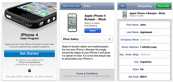 Apple hat das ganz geschickt gemacht: Für iPhone4 Besitzer mit Empfangsproblemen hatte Steve Jobs ja vorletzte Woche eine kurzfristige Lösung versprochen. Nun bringt Apple die kostenlose App iPhone 4 Case Programm heraus, die sich alle iPhone 4 Besitzer runterladen können. In dieser App, die auch nur auf iPhones 4 läuft, kann man nun schnell und einfach den von Apple kostenlos angebotenen Bumper oder die Schutzhülle bestellen.