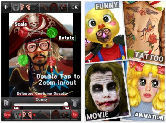Mit dem gut bewerteten Programm Movie Costume Pro kannst Du Bilder so bearbeiten, dass fotografierte Personen wie Filmstars oder Figuren aus Animationsfilmen aussehen. Dazu stehen 280 Bildelemente zur Verfügung, die Du drehen, vergrößern, verkleinern und verschieben kannst. Durch die Auswahl der Deckkraft der Bildelemente kannst Du eine Art Morphing machen, also verschiedene Bildelemente vermischen, bis Dir das Ergebnis gefällt. Die App kann sehr viel, gerade auch im Vergleich mit anderen Apps, die Bildverfälschungen erlauben.