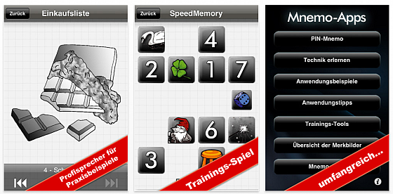 Zum Trainieren der Merkbilder und der Technik sind spezielle Trainings-Tools für das iPhone entwickelt worden. Diese Mini-Spiele trainieren auf unterhaltsame Weise. Highscore-Listen geben die Möglichkeit die eigene Geschwindigkeit zu steigern oder sich mit anderen zu messen.
