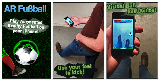 Das hat jeder schon mal erlebt, da redet jemand, ohne dass man einen Gesprächspartner sieht. Die Person gestikuliert und wirkt dadurch irgendwie komisch. Kalr, die telefoniert – heute kennen wir das. Jetzt stellt Euch mal jemanden vor, der völlig gebannt auf sein iPhone guckt, das er vor seinem Bauch hält und dazu mit den Füssen komische Bewegungen macht. So sieht das nämlich aus, wenn man AR Fußball von Laan Labs spielt. Da richtet man sein iPhone auf die eigenen Füße und spielt dann mit einem Ball, den die Software in das Bild der Kamera hineinbringt. Und das funktioniert tatsächlich sehr gut. Fachleute und Aufschneider nennen das dann Augmented Reality, also die Kombination realer Umgebungen mit digitalen Inhalten. Man kennt das zum Beispiel von Around Me, der App, die in das Kamerabild Informationen zur Umgebung einblendet.