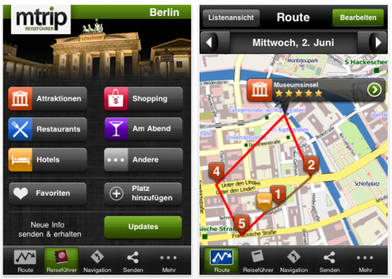 Wer bisher nicht mitgelesen hat: mTrip hat einige Reiseführer zu den Metropolen veröffentlicht, die die Funktion von iPhone und iPod Touch richtig ausnutzen. Herausragend ist die Möglichkeit, sich mit Hilfe des Reiseführers im Vorfeld der Reise nach Eingabe der voraussichtlichen Reisedaten eine komplette Empfehlung der Besichtigungsmöglichkeiten ausarbeiten zu lassen, so kann man zwischen heftigem Besichtigungsprogramm und einem weniger stressigen Tagesablauf wählen.