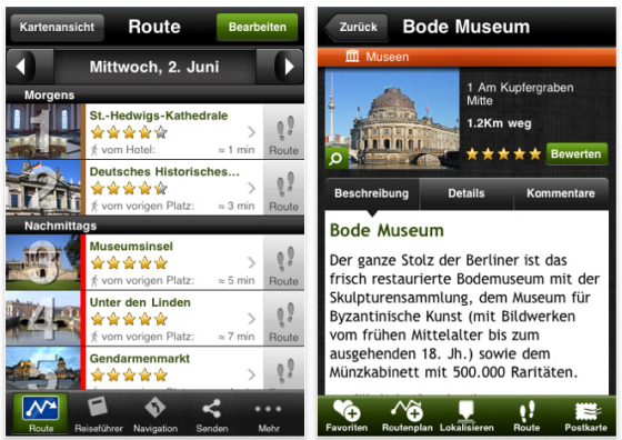 Rechts sieht man die tabellarische Aufstellung der Besichtungstour eines Tages, links die Detailansicht vom Bode Museum