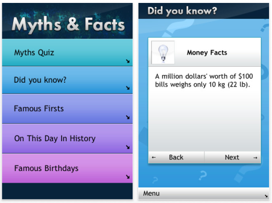 Die App enthält angeblich 10.000 (!) solcher Geschichten und Behauptungen, sowie mehr oder weniger nützliche Fakten und es gibt ein Quiz mit 96 Fragen, wo man gefragt wird, ob die Geschichte, die so erzählt wird, sich tatsächlich so zugetragen hat. Das Quiz kann man entweder nach Themengebieten oder mit zufällig ausgewählten Geschichten spielen.
