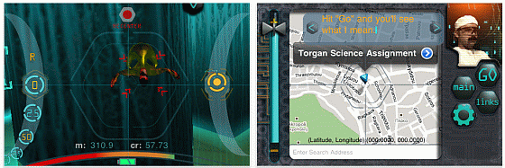 Links sieht man den Blick aus der Drohne mit den Steuerungselementen auf der rechten Displayseite. Vor Euch fliegt so ein Geist, den Ihr abschießen solltet, damit eure Batterie geschont wird. Rechts die Kartenauswahl. Unten gebt Ihr einfach Eure Wunschadresse ein und das Programm beamt Euch in die zur Adresse gehördende Parallel-Welt. Oben im Screen seht Ihr Karl, Euren Techniker und Ratgeber.