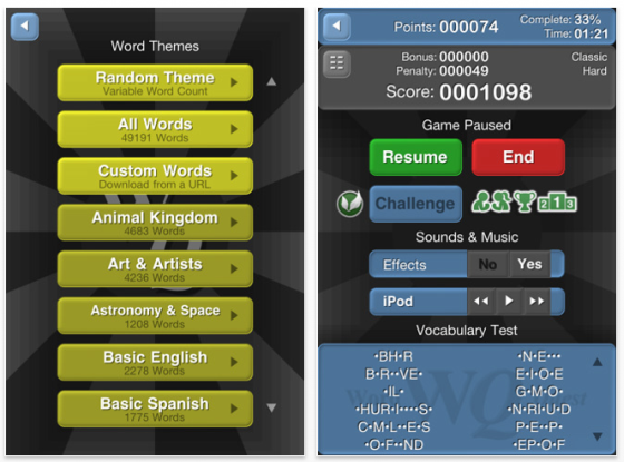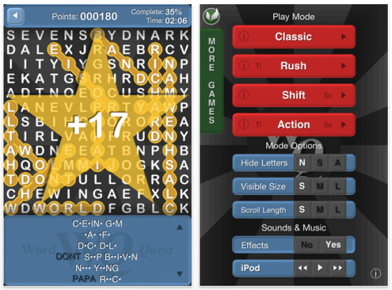 Classic: Das ist das klassische Spiel, wo man auf dem quadratischen Spielfeld vorgegebene Worte finden soll. Je nach Schwierigkeitsgrad können Worte auch rückwärts geschrieben sein oder sich kreuzen. Zur Lösung gibt es keine Zeitvorgabe.