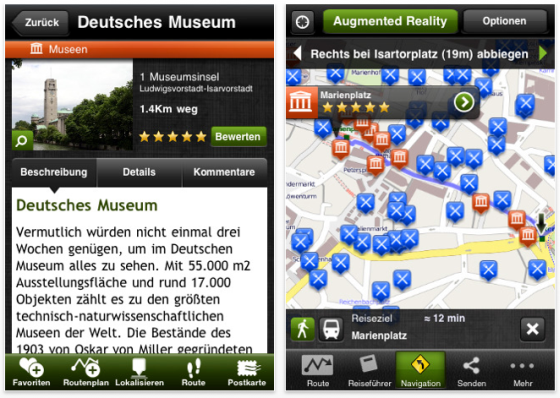 Der erste Bildschirm zeigt die Detailseite des Deutschen Museums, der zweite Bildschirm eine Kartenansicht für Augmented Reality.