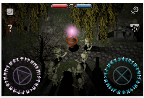 So sieht der Kampf-Screen aus. Rechts schießt man, links bewegt man seinen kleinen Zauberer.Der rote Balken oben zeigt die Gesundheit, der blaue Balken zeigt das Mana.