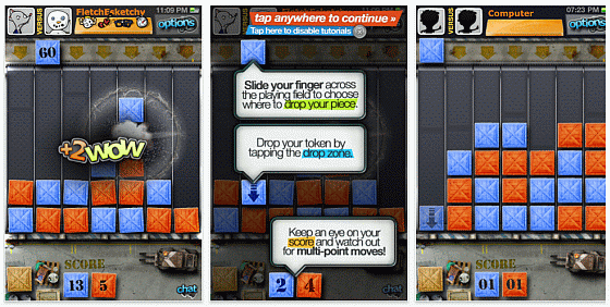 Das Spielfeld besteht aus 49 Feldern. Deine Aufgabe ist es, möglichst oft vier Deiner Boxen in senkrechter, waagrechter oder diagonaler Ausrichtung zu platzieren. Die zu platzierende Box erscheint oben und Du schiebst sie mit Finger auf dem Display auf das Feld, wo Du sie haben möchtest. Dein Gegner macht es genauso. Wie immer nbei 4 Gewinnt ist es ratsam, zu versuchen, 3er Kombis mit beidseig offenen Ende zu schaffen. Das ist aber nicht so einfach, wenn der Gegner aufpasst. Durch das Auflösen der 4er Gruppen rücken die anderen Boxen auf die frei werdenden Plätze – auch dadurch kann man gute Kombinationen schaffen. Die Spiele gegen den Computer endeten bei mir, wenn ich viermal einen 4er geschafft hatte. Auch beim Online-Spiel, für das im Game-Center ein Gegner gesucht wird, war das Spiel nach meinem vierten 4er beendet. Hier lag der Gegner mit zwei Vierern vorn, durch das Nachrücken der Boxen hatte ich dann aber – schon fast zufällig – gleich drei Vierer. Dadurch war der Gegner wohl so perplex, dass er den Dreier nicht bemerkte und beim nächsten Zug verlor. Damit will ich sagen, dass man zwar extrem aufpassen muss, nicht auf die typischen 4 Gewinnt Tricks reinzufallen, dass einem aber auch der Zufall durch das Nachrücken der Boxen behilflich sein kann.