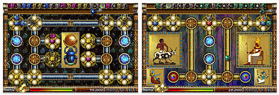 Zum Spiel: Oben werden Murmeln (Edelsteine) bereitgestellt, die dann langsam einen Gang entlang rollen. Du hast verschiedene Horus-Scheiben, die jeweils vier Murmeln aufnehmen können und die Du drehgen kannst. Durch tippen auf die Scheiben drehst Du sie. Die Murmeln kannst Du per Fingerstrich aus einer Scheibe in den nächsten Gang schicken. Achte auf den Scrabeus in der Mitte der Horus-Scheibe. Seine Farbe verrät Dir, welche Murmeln in die Scheibe aufgenommen werden. Hast Du vier Murmeln zusammen, bekommst Du die Perle.
