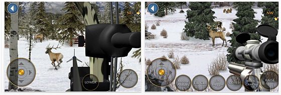 Hat man sich für eines der gelb markierten jagdgebiete entschieden, beginnt die Jagd. Recht realistisch ist, dass man zum Teil länger warten muss, bevor amn überhaupt mal ein Tier zu sehen bekommt. Die Hintergrundgeräusche sind sehr realistisch, da hört man den Wind, der Schnee knirscht und zwischendurch gibt es verschiedene Vögel, die man hört. Wenn länger nichts passiert, kann man Elche zum Beispiel anlocken, indem man den Elchruf nachahmt. Das funktioniert dann auch. Wenn man den Button „Raise“ antippt, schaut man durchs Zielfernrohr, die Steuerung erfolgt über einen Button links unten auf dem Screen – sie ist sehr präzise. Schießen kann man natürlich nur, wenn man das Gewehr in über „Raise“ angehoben hat. Die Tiere bewegen sich recht natürlich, so edass man über den Button unten links gefühlvoll nachjustieren muß, bevor man schießen kann. Wenn man keine Lust zum Schießen hat, kann man auch die Gegend mit dem Fernglas beobachten und sogar Screenshots machen, die man verschicken kann. Auch erhaltene Trophäen kann man per Email versenden, obwohl ich kaum glaube, dass man das hierzulande machen würde.