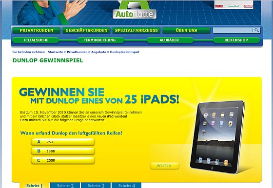 Die Reifenhandelskette Euromaster hat eine neue Homepage freigeschaltet und verlost aus diesem Anlaß zusammen mit dem Reifenhersteller Dunlop 25 Apple iPads. Leider werden diese in der Ausschreibung nicht näher bezeichnet, so dass man wohl davon ausgehen kann, dass es sich hier um das Einstiegsmodell handelt. Beantwortet werden muss nur die frage, wann John Boyd Dunlop den luftgefüllten Reifen erfunden hat. Die Antwortenauswahl ist so gestaltet, dass es keines weiteren Hinweises bedarf. Wer doch einen Tipp braucht, findet die Lösung hier.