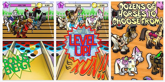 Es gibt ein Level-System, über das man Erweiterungen bekommt und verschiedene Ligen, in denen man antreten kann. Man startet in der Copper-League und erst, wenn man sein Pferd an die Tabellenspitze bekommen hat, steigt man in die nächst höhere Liga auf. Während des Rennens leuchten manche Löcher auf, wenn man diese dann trifft, gibt es Extra-Energie oder andere Goodies. Nach dem Rennen wird die aktuelle Platzierung in der Tabelle angezeigt. Nun kann man aber nicht unendlich spielen, sondern wird auch daran erinnert, dass das Pferd beim Rennen Energie verbraucht. Wie heute üblich, kann man in einem Shop gegen echtes Geld über iTunes Äpfel (Nahrung) und Hufeisen (Pferd wird schneller) kaufen. Wer das nicht möchte, muss dann warten, bis die Pferde wieder ausreichend Energie aufgebaut haben. Im Spiel gibt es auch eine Währung. Man bekommt für jede Rennteilnahme Geld, abhängig von der Platzierung. Für den Sieg gibt es 500 und dann für jeden Platz schlechter abgestuft 100 weniger. Mit diesem Geld kann man weitere Pferde kaufen, die dann immer schneller werden.