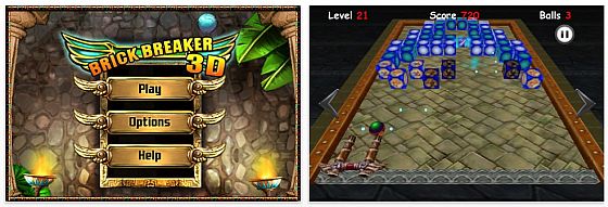 Das Spiel Brick Breaker 3D ist die Umsetzung des klassischen Brick-Breaker-Spiels in dreidimensional. Das ist erst etwas gewöhnungsbedürftig, sieht aber gut aus und bringt auch Spaß. Es gibt zwei Spielmodi: klassisch und Ziel-Modus sowie zwei Möglichkeiten, das Paddle zu steuern. Wie bei den Spielen üblich, rollen immer wieder Goodies und Badies an, die man aufsammeln oder denen man ausweichen sollte.