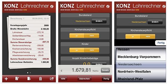 Kostenlos gibt es derzeit den am 25.10. erschienen Lohnrechner von Konz. Mit ihm man ganz einfach ausrechnen, was eine Gehaltserhöhung bringt und wieviel man brutto verdienen muss, um auf ein bestimmtes Nettogehalt zu kommen. Mit dieser kleinen App kann man sich gut auf Gehaltsverhandlungen und Vorstellungsgespräche vorbereiten. Gut ist auch, dass man mit dem Rechner in die Zukunft sehen kann: Man kann nachsehen, wie sich die Änderungen bei den Sozialversicherungen und Steuern im nächsten Jahr auf das Gehalt auswirken werden.