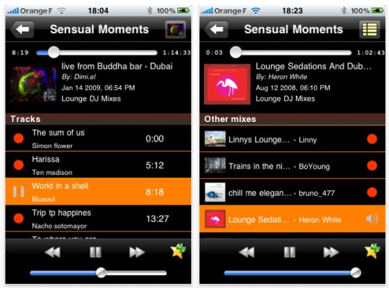 In Sensual Moments geht es um gefühlvolle Musik, die die Seele streichelt. Chillige Töne und eher langsame, phantasievolle Tracks stehen im Vordergrund. Jetzt ist die App sogar Multitaskingfähig und iOS4 kompatibel. Man kann sie also auch – wenn man nachts nichts Besseres zu tun hat, zum Einschlafen nutzen oder als Hintergrunduntermalung beim nächtlichen Schreiben… Man hat Zugriff auf tausende Mixes aus dem Bereich Sensual Music, ich höre zum Beispiel gerade Latina Girl in Brazil von VD Sounds, einen Mix, der die brasilianischen Songs, die man so kennt neu zusammengemixt zu Gehör bringt und so als Easy Listener gut funktioniert – ich sehe gerade, dass der Track immerhin eine Stunde lang ist. Da er mir gefällt, habe ich ihn gleich mal zu den Favoriten hinzugefügt.