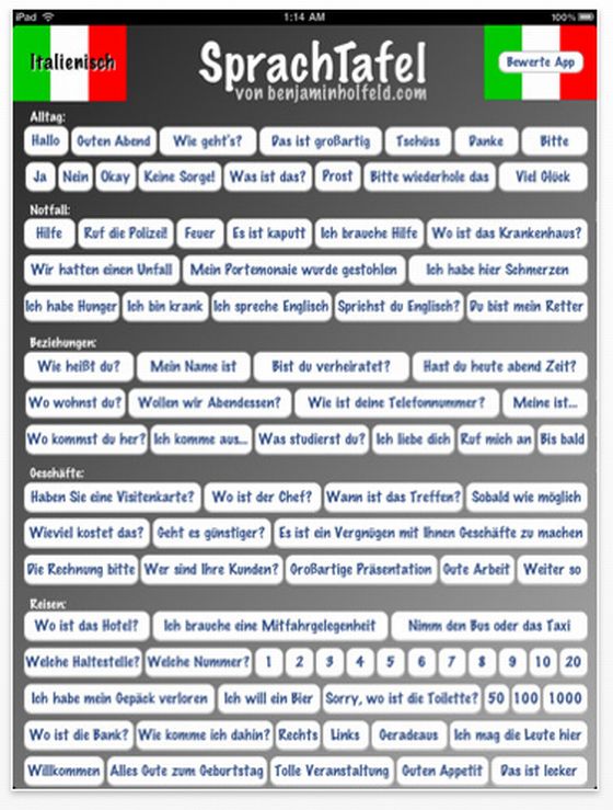 Heute ist die Sprachtafel Italienisch von Benjamin Holfed für das iPad kostenlos. Wir haben die Sprachtafeln ja schon mehrfach vorgestellt, deshalb jetzt nur die Kurzform. Auf einer iPad Seite werden die 80 wichtigsten Sätze einer Sprache dargestellt, die dann bei Tipp auf einen der Sätze oder Zahlen vorgelesen werden. Ausgangssprache ist hier Deutsch. Einfach für die Reise oder für den nächsten Besuch beim Italiener.