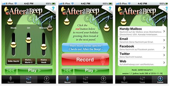 After the Beep Christmas Edition IconAuf bunten Pappkarten verschickte Weihnachtsgrüße – das gehörte bisher zum guten Ton – und bei vielen wird es auch so bleiben. iPhone Besitzer können nun eine neue Möglichkeit nutzen: Wer auf den letzten Drücker noch rasch ein paar persönliche Wünsche zum Fest an alle Verwandten, Freunde oder Bekannte versenden möchte, benötigt nur ein iPhone, einen iPod touch oder ein iPad – und die kostenlose App „Weihnachtsgrüße – After the Beep!„.