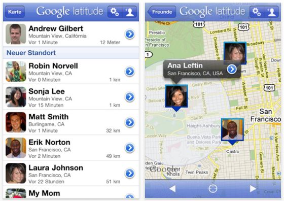 iPhone- und iPod Touch Besitzer (mit WiFi-Anbindung) können nun mit Google Latitude ihren Freunden ganz genau mitteilen, wo sie sich gerade aufhalten. Natürlich können Sie bei Ihren Freunden, die ebenfalls Latitude nutzen und Sie freigeschaltet haben, auch sehen, wo diese sich gerade befinden. Vielleicht möchten Sie in Ihrer Familie auch wissen, wer gerade wo ist? Die App bietet alle Einstellmöglichkeiten, Sie können auch die Genauigkeit der Anzeige Ihrer Position anpassen und zum Beispiel nur die Stadt zeigen, in der Sie sich gerade aufhalten, Sie können Aktualisierungen Ihres Standortes abschalten oder sich auch ganz unsichtbar machen.