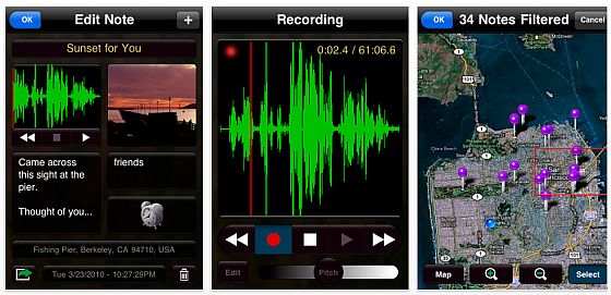 Der linke Screen zeigt eine Notiz mit Audio, Text, Foto und Ort, in der Mitte siehst Du die Audioaufzeichnung, deren Wiedergabe Du in verschiedenen Geschwindigkeiten abspielen kannst, rechts ein Kartenausschnitt mit markierten Notizen zum Aufrufen.