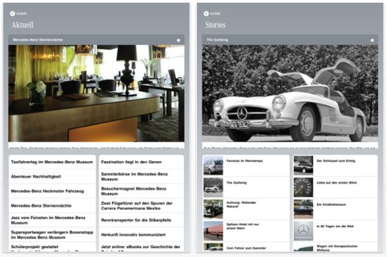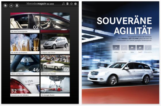 Für Mercedes-Fans ist auch die App Mercedes-Magazin interessant, hier kann man multimedial das Mercedes-Kundenmagazin lesen. Es gibt also Videobeiträge, Interviews und interessante Reisevorschläge. Dazu kommt in jeder Ausgabe eine Vorstellung eines beliebten Mercedes-Klassikers und natürlich ausreichend Informationen zu aktuellen Modellen, Studien und Aktivitäten des Autoherstellers.