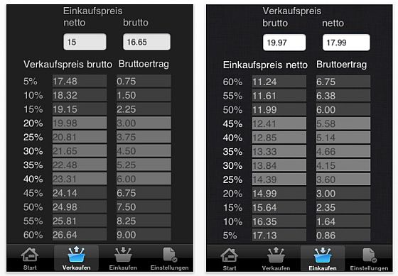 Mit der App MCB Margin Calculator Board von werk55 seamless data solutions für iPhone und iPod Touch, die normal 79 Cent kostet, kannst Du ganz bequem Margen ausrechnen. Das Programm zeigt Dir, welchen Verkaufspreis Du nehmen musst, wenn Du auf den Einkaufspreis der Ware Deinen prozentualen Wunschaufschlag kalkulierst. Du kannst aber auch feststellen, wie Dein Einkaufspreis sein sollte, wenn Du den Artikel zum Preis von X Euro verkaufen möchtest. Ein kleines, sinnvolles Tool für alle, die Produkte verkaufen. Die App steht in verschiedenen Sprachen zur Verfügung. Der Mehrwertsteuersatz wird über Einstellungen angepasst.
