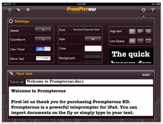 Dass das iPad durch die vielfältigen Apps zu einem Alleskönner wird, wissen alle iPad-Nutzer. Die heute vorzustellende App Prompterous HD macht aus Deinem iPad jetzt einen richtigen Teleprompter, der Dir bei Vorträgen, Auftritten vor Publikum und Interviews helfen kann, Deinen Text und die Vortragsstruktur nicht zu vergessen. Auch Bands nutzen gerne Teleprompter, um beim Gesang keine Hänger zu haben und Blackouts zu vermeiden. Die App importiert 24 verschiedene Dateiformate, darunter .doc, .pdf und .txt.