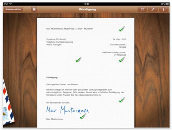 Um es dem Nutzer noch einfacher zu machen, bietet Aboalarm ein Kündigungsformular mit an, welches dann sogar kostenlos an den Vertragspartner gefaxt wird.Das Formular ist weitestgehend vorausgefüllt. Man muss nur noch die Vertragsnummer einsetzen. Es gibt bereits Vorlagen für 16.5000 Unternehmen und Verträge, die die jeweiligen Besonderheiten integrieren. Die Fertigstellung der Kündigung per Finger auf dem Display ist schnell erledigt und verringert den Aufwand für die Durchführung einer Vertragskündigung deutlich.