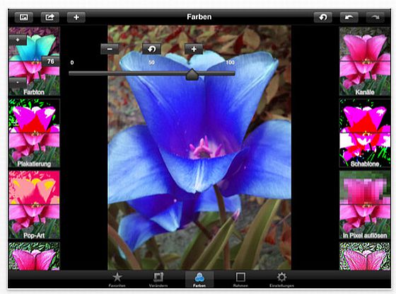 Links und rechts vom Bild werden die anwendbaren Effekte jeweils mit kleiner Vorschau angezeigt. Tippt man auf die Zahl auf einem Effektbildchen, so kann man ganz genau den Effekt einstellen.