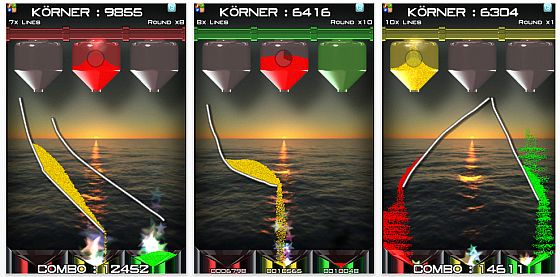 Ein ganz besonderes Puzzlespiel für iPhone, iPod Touch und iPad ist Sand Slides von Logic State. In diesem Spiel ist es Eure Aufgabe, den farbigen Sand in die dafür vorgesehenen Behältnisse zu leiten. Dazu zeichnet Ihr mit dem Finger auf dem Display Rutschen, über die der Sand in das richtige Behältnis fließen kann oder Eimer, mit denen Ihr den Sand zwischenlagern könnt. Der Haken dabei: Die Sandspender oben werden immer schneller befüllt und öffnen sich nach Ablauf der eingeblendeten Uhr automatisch. Man muss also aufpassen, dass man nicht durcheinander kommt. Läuft der Sand falsch, werden Partikel aus einem Vorrat von 30.000 abgezogen – und wenn man keine mehr hat, ist das Spiel verloren.