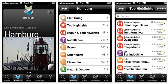 Der von mir geladene City-Guide Hamburg ist gut gestaltet, hat aber erhebliche Schwächen bei den Inhalten. Ganz rechts sieht man, dass unter den Top Sehenswürdigkeiten unten schon die erste Bar kommt, alles was darunter noch kommt, ist definitiv keine Top-Sehenswürdigkeit der Freien und Hansestadt Hamburg.