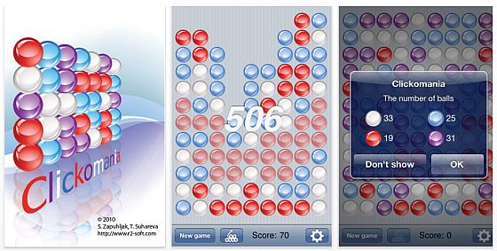 Gerade sind Clickomania für iPhone und iPod Touch sowie Clickomania HD für das iPad kostenlos im Download. Clickomania ist ein Spiel, in dem Du die Bälle vom Spielfeld räumen musst, indem Du auf Gruppen gleichfarbiger Kugeln tippst, die sich dann auflösen. Ziel ist es, möglichst wenig Kugeln übrig zu lassen. Nur wenn Du das Spielfeld komplett geräumt hast, bekommst Du einen Bonus. Während des Tippens bekommst Du – je nach Größe der gerade aufgelösten Kugelgruppe unterschiedlich viele Punkte.